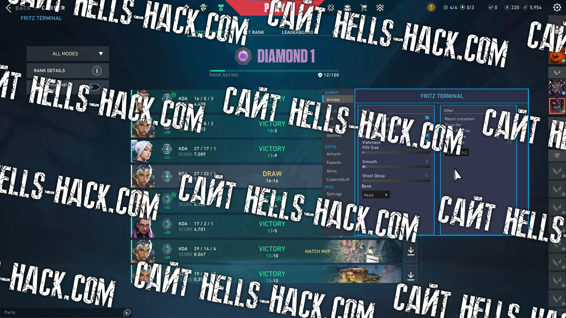 Вы просили и я наконец-то выкладываю актуальный чит FritzTerminal последней версии на игру Valorant без бана. В этом мощном чите доступны следующие топовый, рабочие функции: Aimbot, Chams, Wallhack, Esp, Unlock All Skins, ThirdPerson, BunnyHop, AntiAim, SpinBot. Эти функции созданы для того, чтобы наделить тебя мощью про игрока, который уничтожает десятки противников. В меню доступны большое количество опций и настроек, чтобы ты мог гибко сконфигурировать мультихак и был вне поле античита, дабы никто не смог заподозрить тебя в использовании читов.
