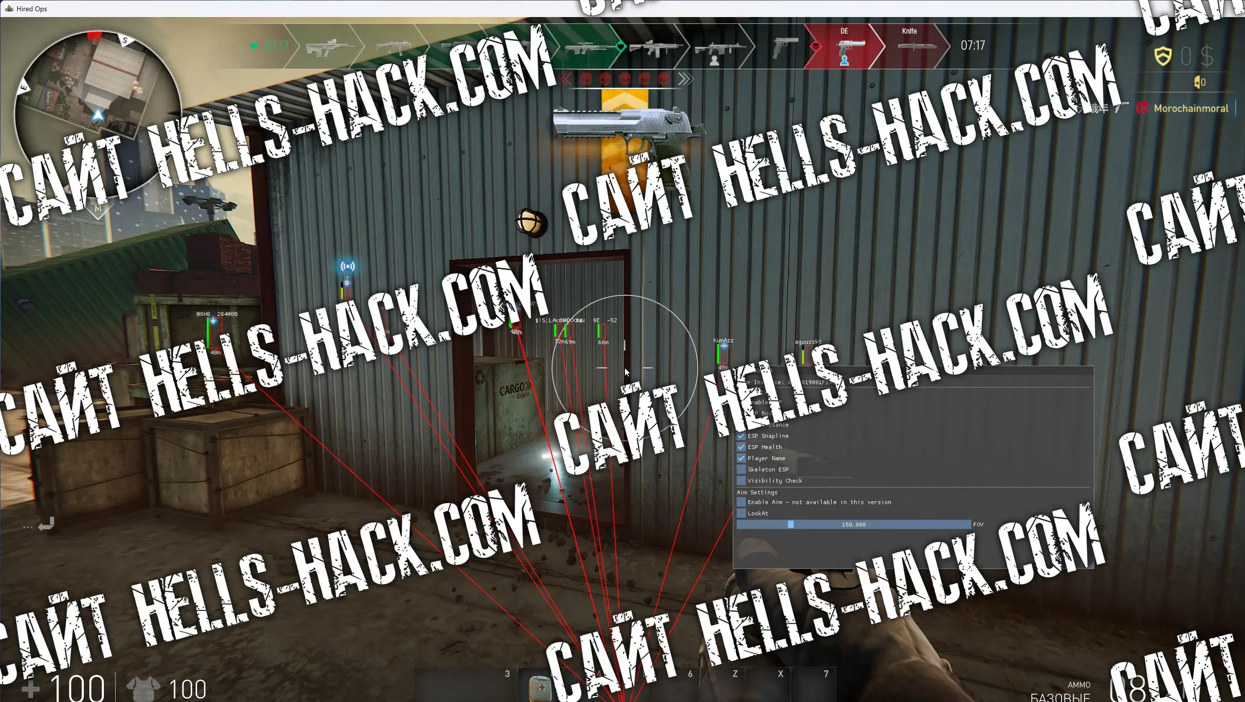 Рекомендую скачать актуальный чит IVCODDER HACK на Hired Ops Steam с функцией ESP, который в народе прозвали как валлхак. С этим читом отлично видно игроков через стены и точное количество их здоровья, как это показать на скриншоте. Я прокачалась с этим софтом до 20 уровня, бан не получила и поэтому поделюсь с вами этим потрясающим мультихаком. Как его запустить? Просто заинежкти используя один из десятков бесплатных инжектором, открой меню на инстер и активируй нужные хаки.